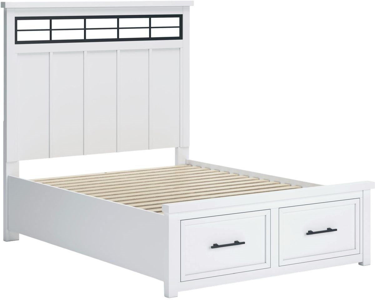 This queen panel storage bed delivers casual style with substance. An inset metal detail on the headboard displays a unique take on modern farmhouse design. The bed's sturdy silhouette, classic white finish and black pulls exude a comfortably cozy vibe in your soothing sanctuary. Storage drawers are spacious enough for all your essentials.Read More