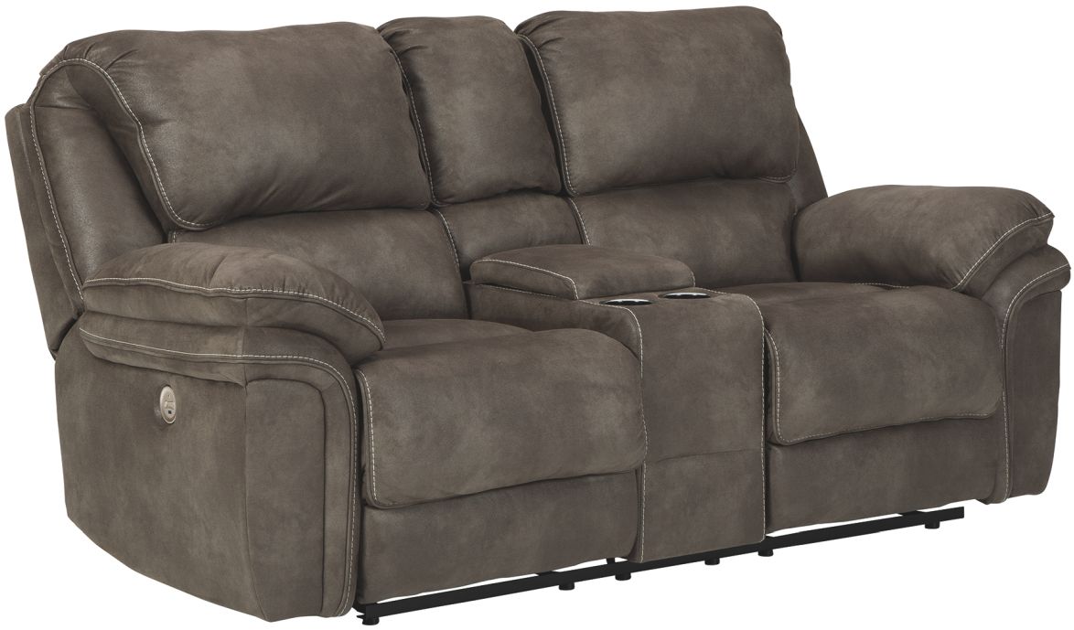 Get the cool leather look you love—and the cozy feel you crave—with this double reclining power loveseat with console in gorgeous graphite. Rest assured, this reclining loveseat’s padded faux leather suede with weathered distressing looks so much like the real thing. Unique design elements include high-contrast jumbo stitching that calls attention to the padded wraparound effect. And talk about pampering. Double padded armrests and back cushioning offer a level of cradling comfort that’s second to none.