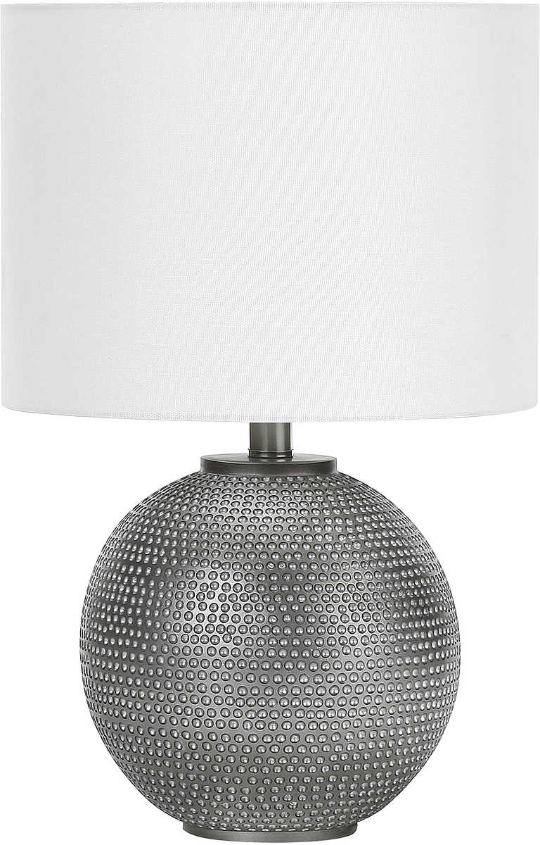 Bring a touch of glam to your living room, entryway, office, or bedroom with this compact, globe shaped 19"H table lamp made with a grey resin textured base and topped with a chic, ivory fabric drum shade for a modern appeal