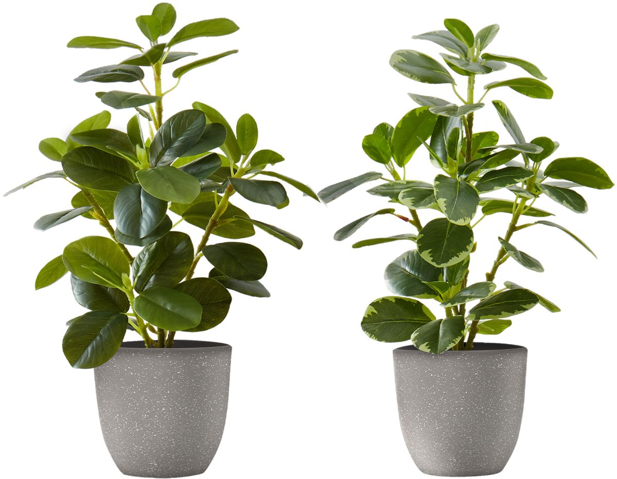 Standing at 14" tall add this set of 2 artificial Ficus Elastica potted plants to bring some greenery to your indoor space.
