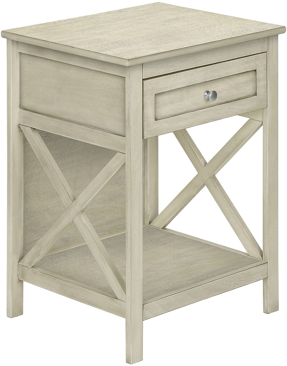 This transitional style, 2-tier accent table in a trendy antique white veneer finish, complimented with an x-design on each side is a practical space saving solution for any room in your home