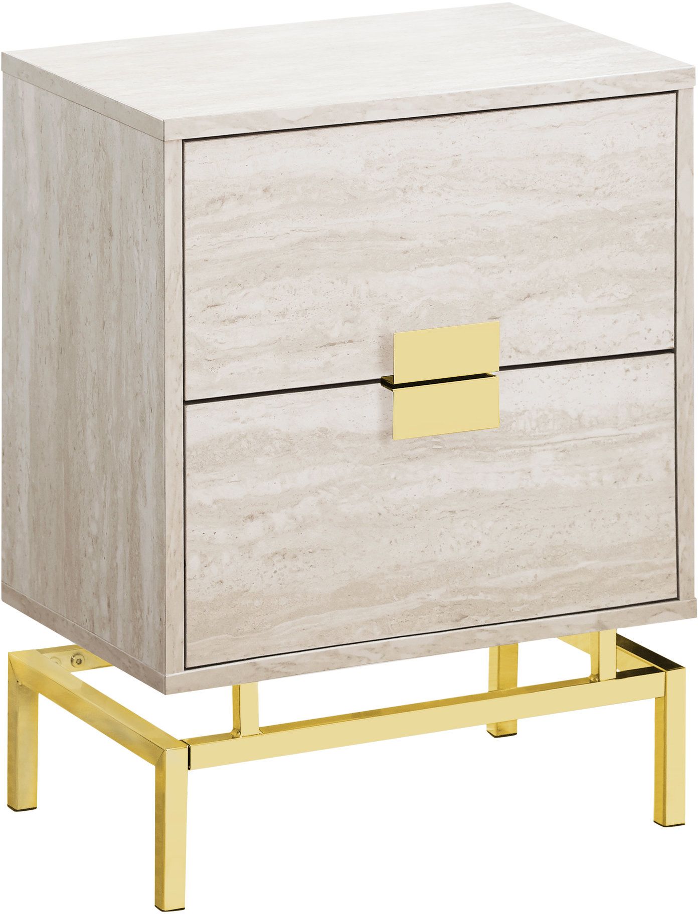 This retro inspired side/end accent table gives a modern glamorous look to a room. Finished in a stylish laminated beige marble-look on all sides, with two large storage drawers on metal glides accented with chic gold metal drawer pulls that meet as one. The bold yet simple gold metal base elevates this accent table to another dimension. Versatile to use as a nightstand for a modern bedroom or next to a sofa or chair as a side table, this is one statement making accent furniture piece. Assembly is required.