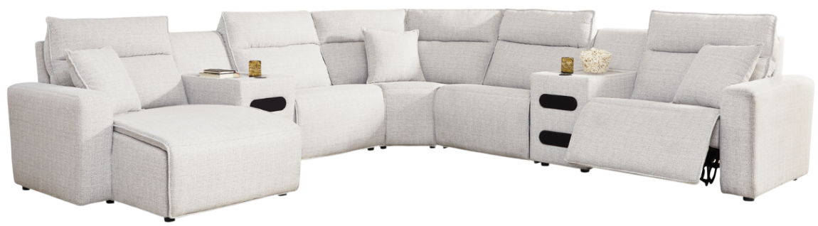 Includes 7 Modular Pieces: Left-arm facing power chaise, power armless recliner, armless chair, wedge, 2 consoles with audio systems and right-arm facing power recliner
